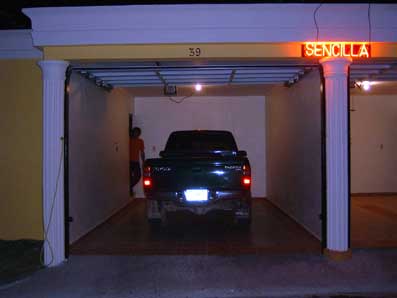 Garage, lässt das Rolltor herab, geht ins Zimmer und meldet sich per